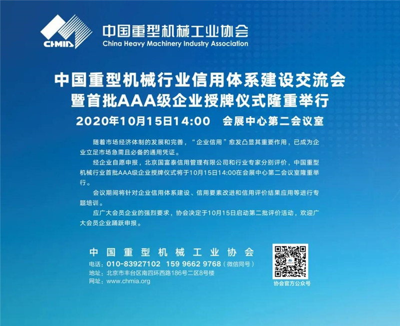 展會期間,河南礦山將在中國重型機械行業(yè)信用體系建設(shè)交流會上暨首批AAA級企業(yè)授牌儀式上,邀您一同參加企業(yè)信用體系建設(shè)、信用要素改進及信用評價結(jié)果等專題培訓(xùn)。