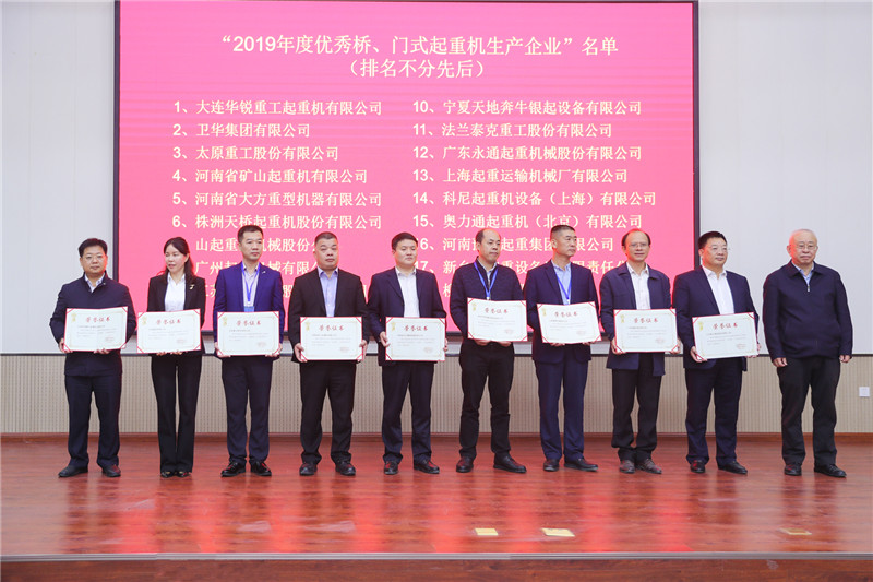 ▲公司榮獲“2019年度優(yōu)秀橋、門式起重機(jī)生產(chǎn)企業(yè)”榮譽(yù)稱號